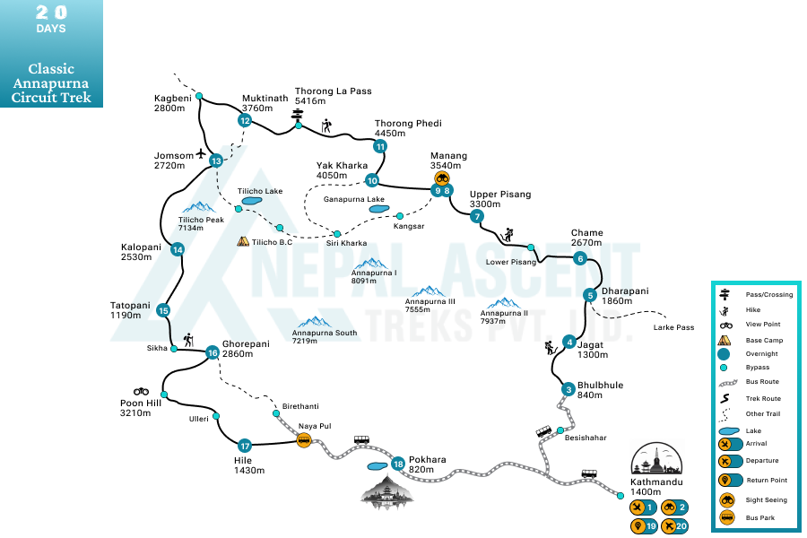Discover the Annapurna region of Nepal with the famous classic Annapurna circuit trek. This 20-day adventure seamlessly blends two popular trek routes, the Annapurna Circuit and the Poon Hill trek, into one fantastic adventure.